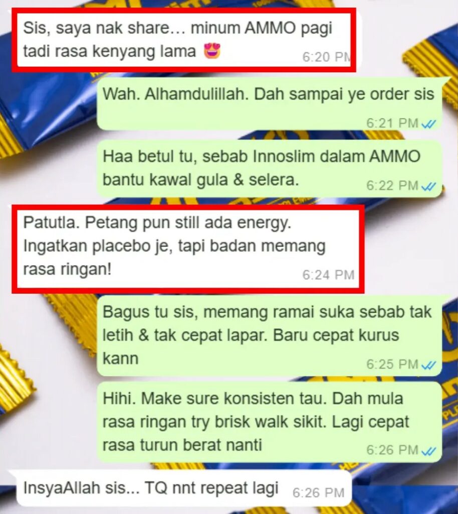 👉 Badan anda tetap boleh nikmati makanan harian tanpa rasa bersalah, sebab AMMO bantu block karbohidrat, gula & minyak daripada jadi lemak simpanan.